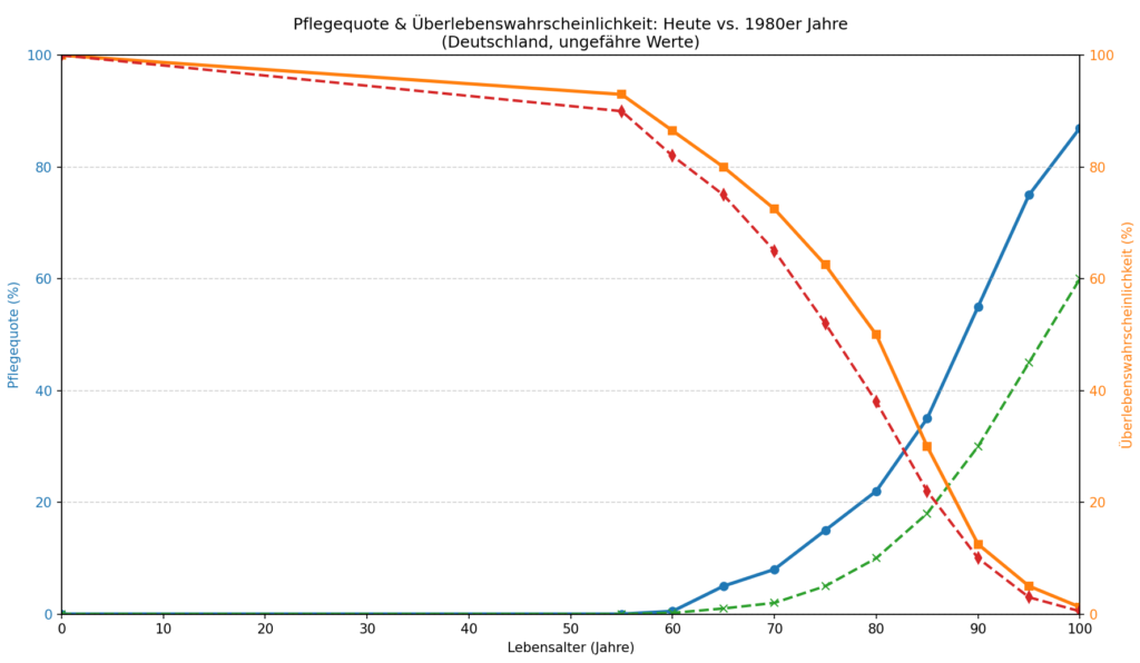 Die Realität liegt irgendwo dazwischen: Die beiden Kurven – Überlebenswahrscheinlichkeit und Pflegebedürftigkeit – kreuzen sich etwa um das 80.–85. Lebensjahr. Ab diesem Punkt verengt sich der Raum für ein wirklich erfülltes, selbstbestimmtes Leben rapide. Ab 70 Jahren ist bereits fast ein Drittel der Menschen verstorben. Von den verbleibenden zwei Dritteln hat jeder Zehnte bereits eine starke gesundheitliche Einschränkung (Pflegegrad 2 oder höher). Der Übergang ist schleichend, nicht sprunghaft – aber er ist unaufhaltsam.